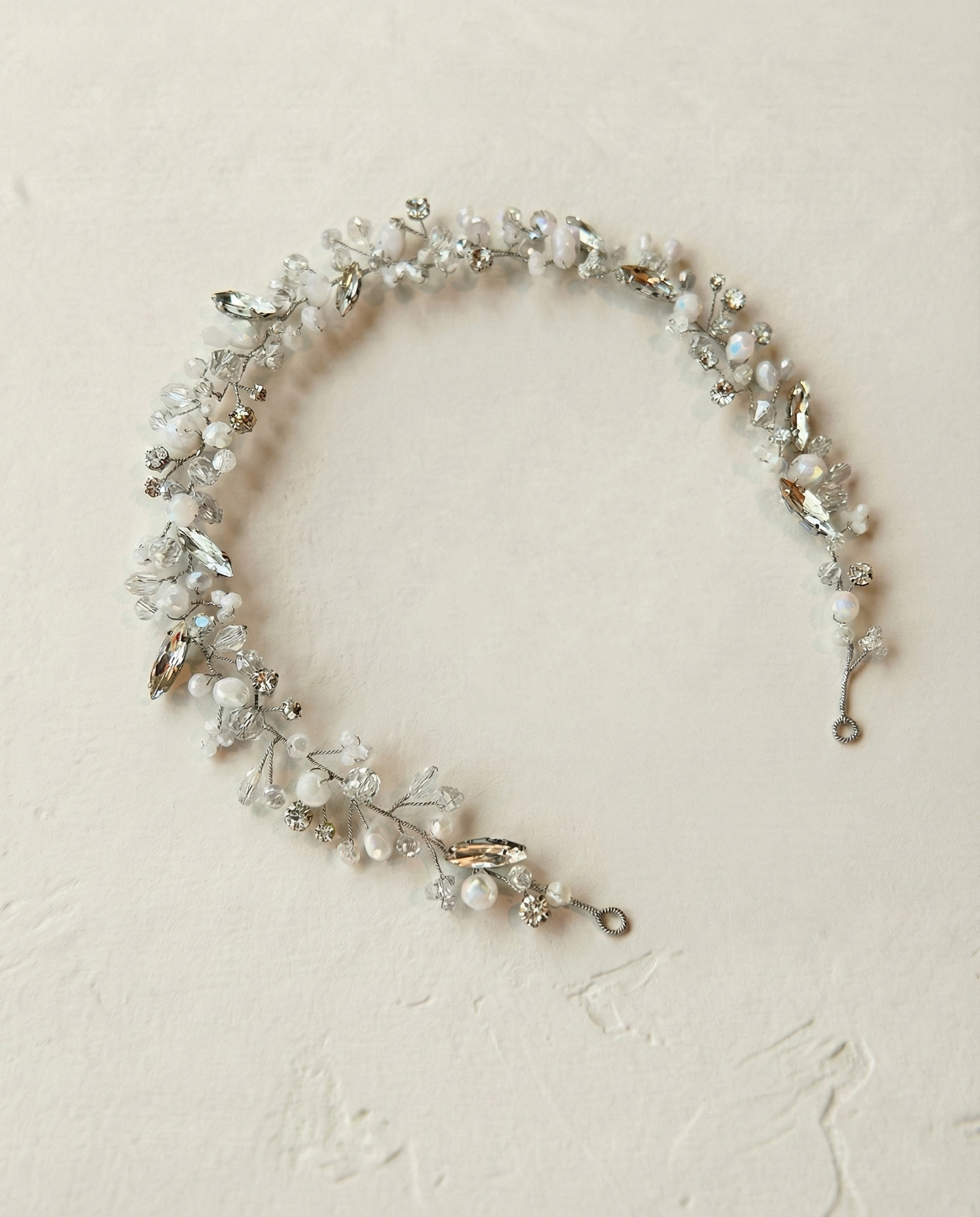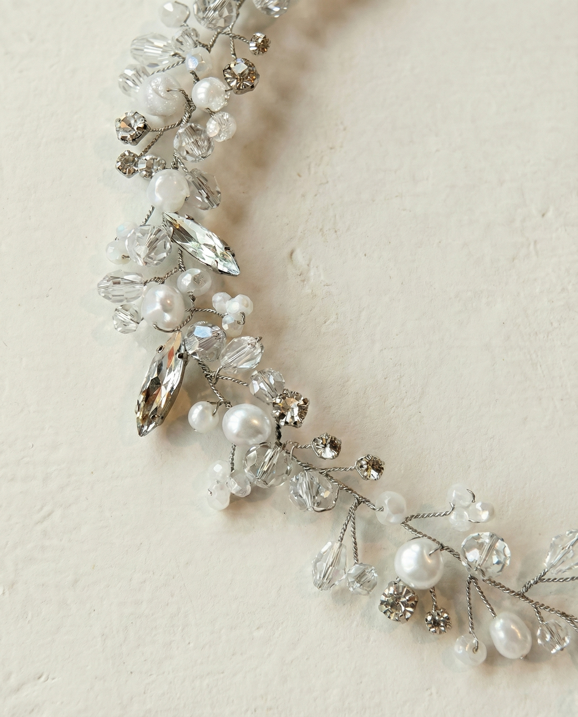 Bridal hair vine silver rhinestones white glass beads mix